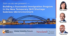 Join Newland Chase Australia Managing Director, Michael Wall, alongside Craig Harman, Group Managing Director – APAC, Opus Talent Solutions, and Carol Caswell, Relocations Team Lead, Nestle Australia Ltd, as they present their panel discussion, Building a Successful Immigration Program in the New Temporary Skill Shortage Subclass 482 Environment.