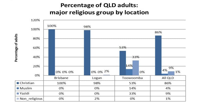While nearly all of the refugees surveyed in Brisbane and Logan were Christians – a consequence of the Turnbull government’s decision to take mainly Christian refugees from Syria and Iraq, Toowoomba has also settled a large number of Yazidi refugees from Iraq, who follow their own religion, and a smaller number of Muslim refugees from Afghanistan.