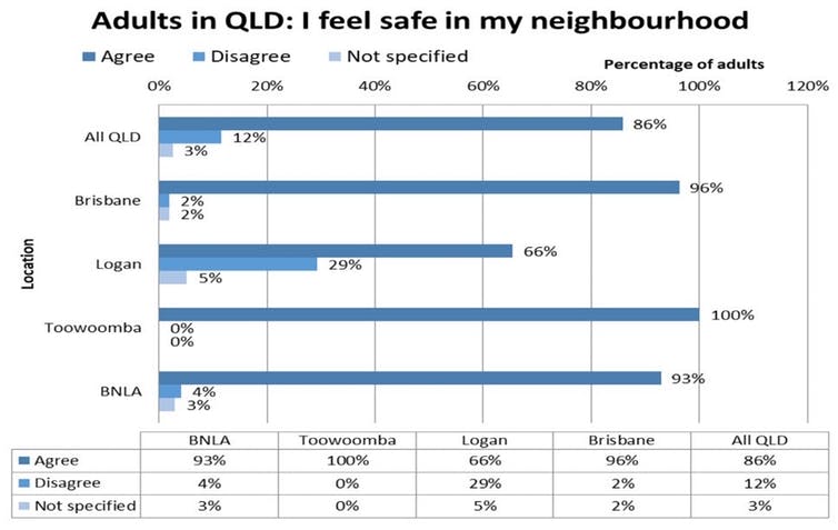 Despite these early difficulties learning English and finding employment, an overwhelming majority of new refugees in Queensland (86%) reported feeling safe in their neighbourhoods, slightly lower than the national BNLA figure (93%). Again, Toowoomba is the standout: 100% of refugees felt safe living there.
