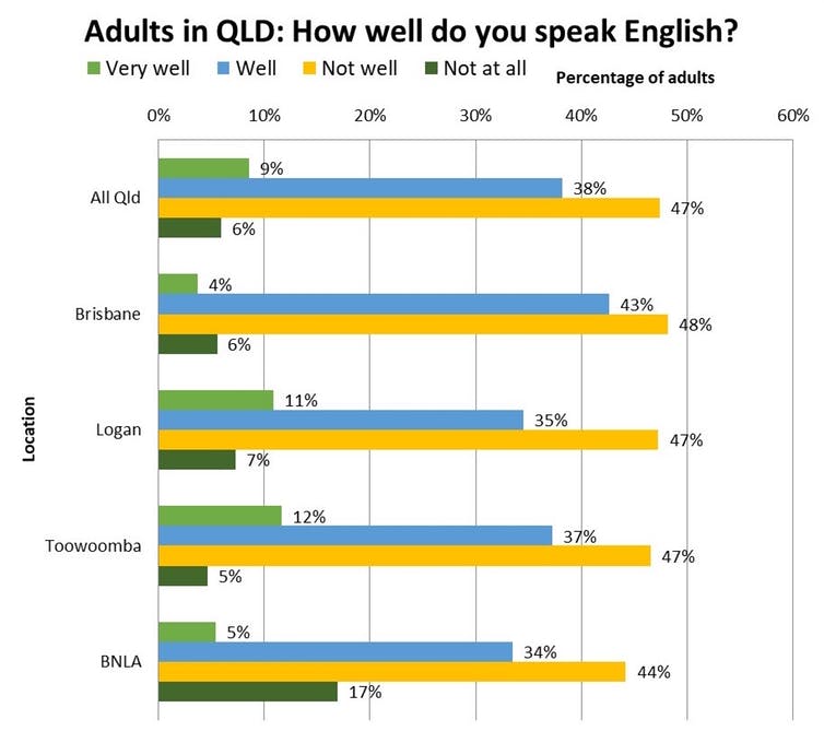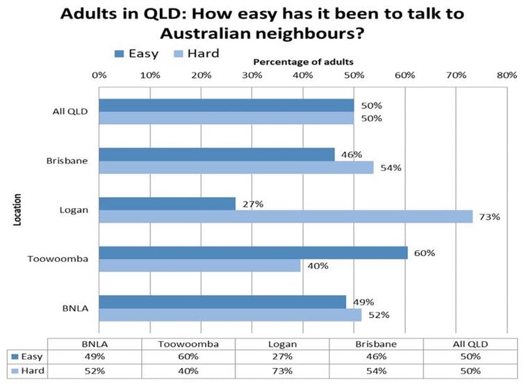 Another indication of the “warmth of the welcome” in regional Australia is the finding that about half of the immigrants in Queensland – and 60% in Toowoomba – found it “very easy” or “easy” to talk to their Australian neighbours, a similar result to the BNLA. When we revisit these families in 2019 and 2020, we expect the numbers will even be higher.