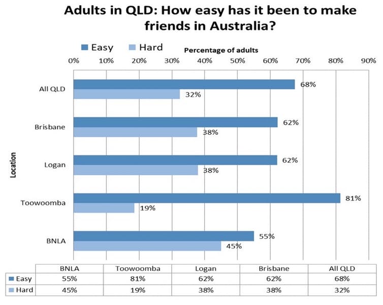 Our new research confirmed this finding, with 68% of the refugees surveyed in Queensland overall – and 81% in Toowoomba – reporting it was “very easy” or “easy” to make friends in Australia.