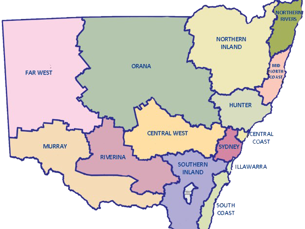 (Far) South Coast | Far West | Hunter | Illawarra | Mid North Coast | Northern Inland | Northern Rivers | Orana | Riverina | Southern Inland | Sydney |